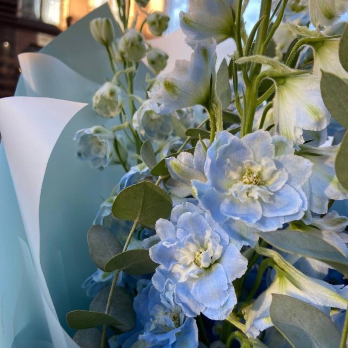 Дельфиниум – 5 шт.Эвкалипт – 3 шт.Лента атласная – 1 шт.Упаковка дизайнерская – 6 шт.