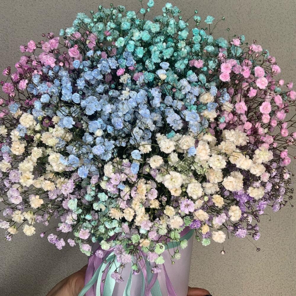 Композиция из гипсофилы будет долго Вас радовать своей свежестью при правильном уходе. Внимание! Оттенки и интенсивность цветов могут незначительно отличаться от фотографии.