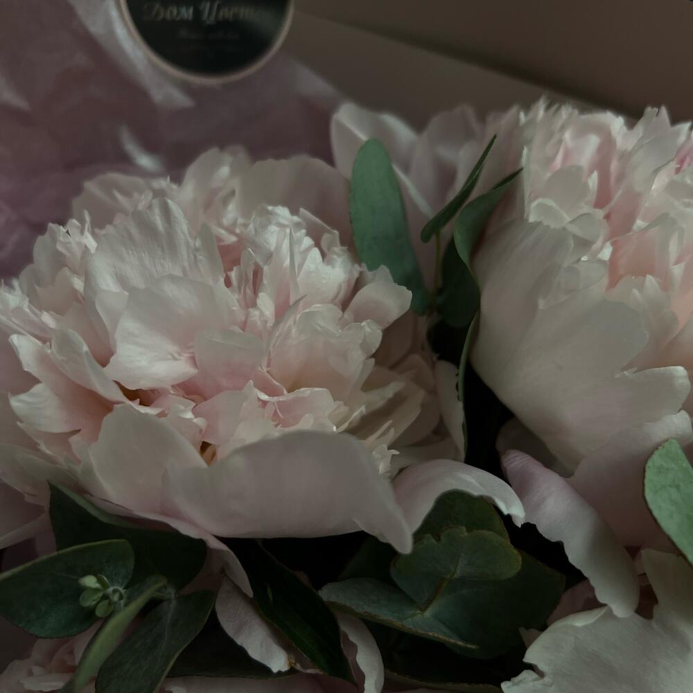 Атласная лента – 1 шт.декоративная упаковка – 1 шт.пионы – 5 шт.Эвкалипт – 3 шт.