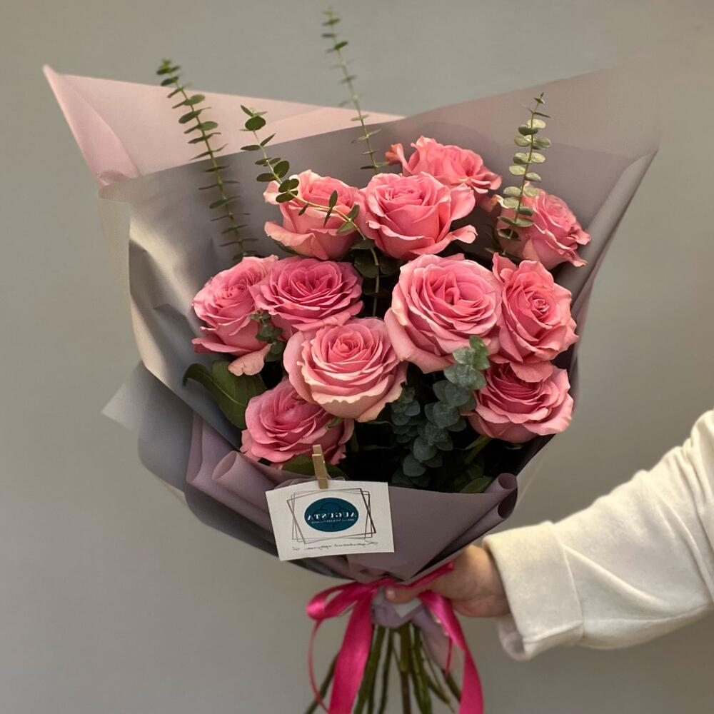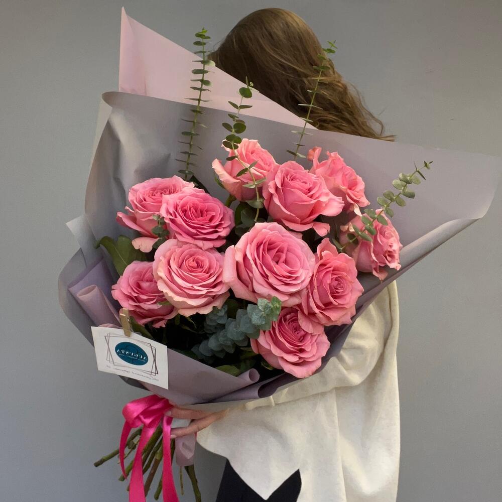 Роза Эквадор – 11 шт.Эвкалипт – 1 шт.Упаковка дизайнерская – 1 шт.Лента атласная – 1 шт.