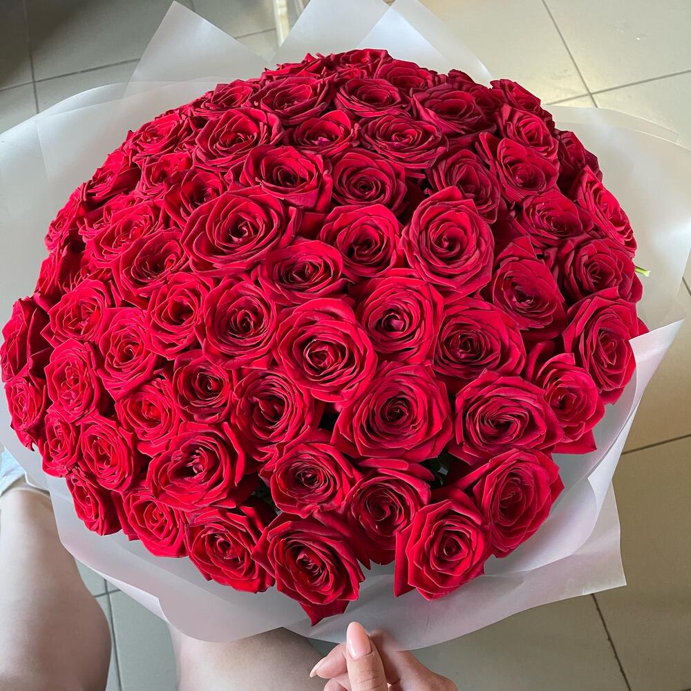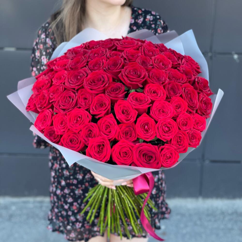 Роза красная 60 см – 75 шт.Упаковка дизайнерская – 4 шт.Открыточка с вашими пожеланиями – 1 шт.подкормка для срезанных цветов – 1 шт.