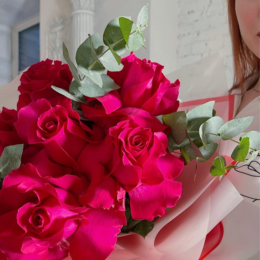 Роза французская – 7 шт.Эвкалипт – 1 шт.Упаковка дизайнерская – 2 шт.Лента – 1 шт.