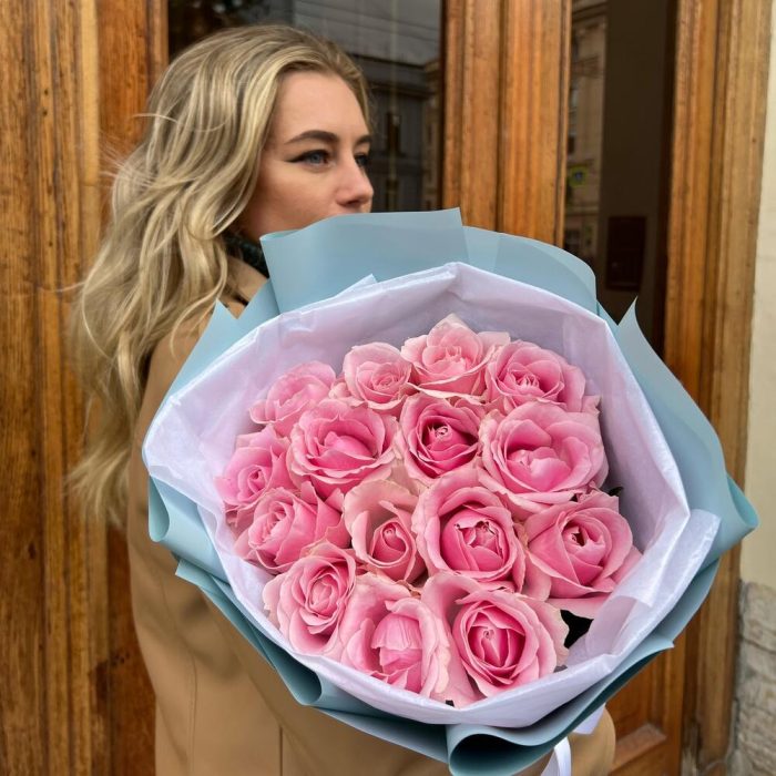 Роза пинк аваланж 60 см – 15 шт.Авторская упаковка – 1 шт.Лента атласная – 2 шт.