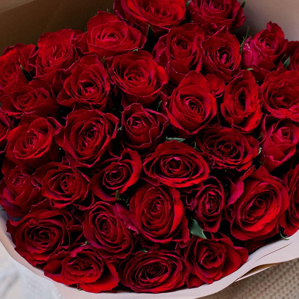 Букет из 35 красных роз (Кения) 40 см в кремовой пленке