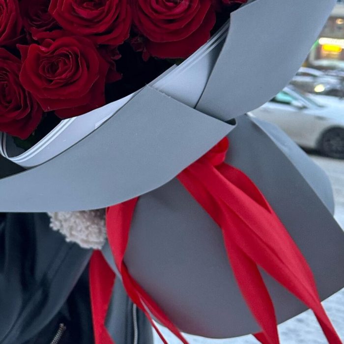 Роза красная – 71 шт.Лента атласная – 1 шт.Пленка дизайнерская – 2 шт.