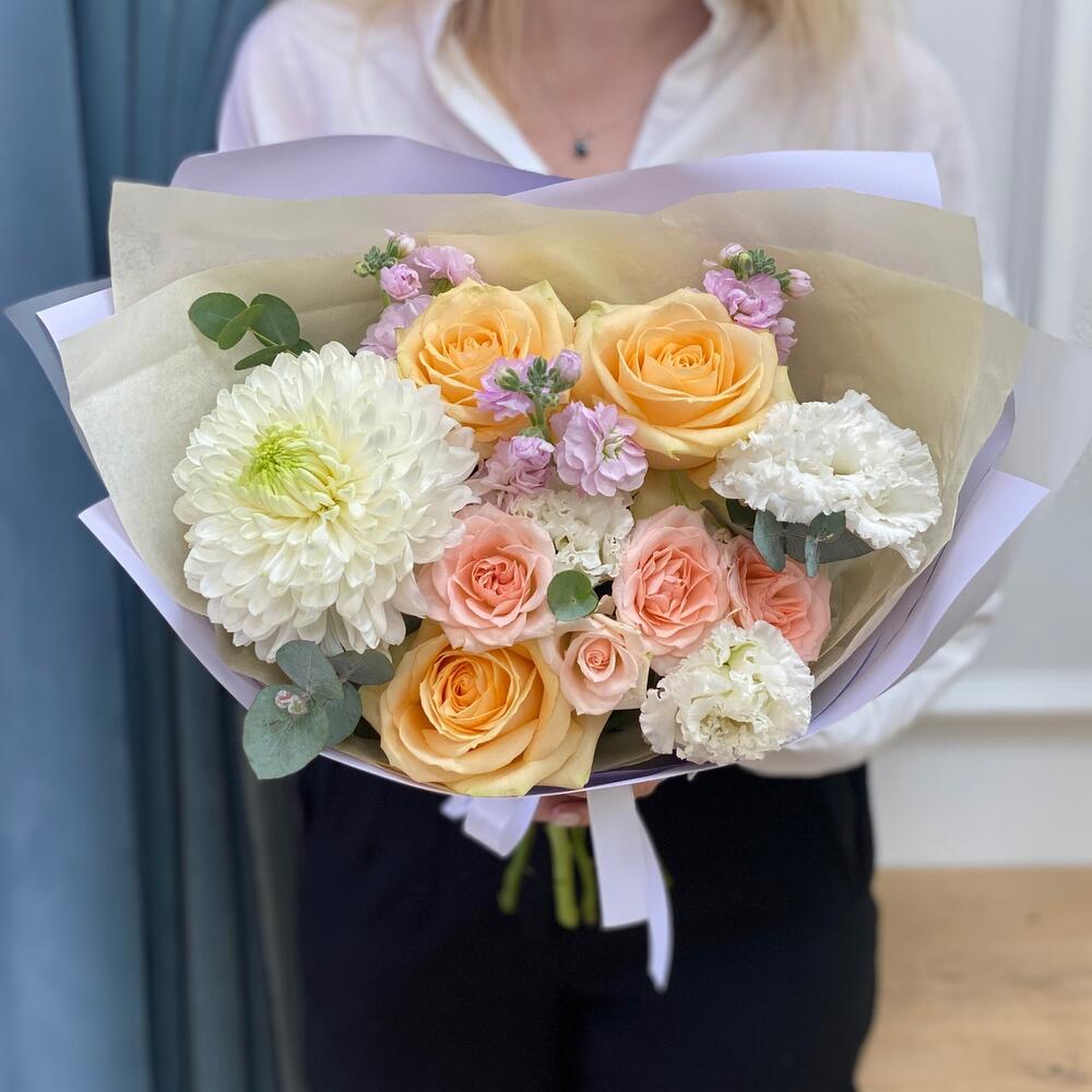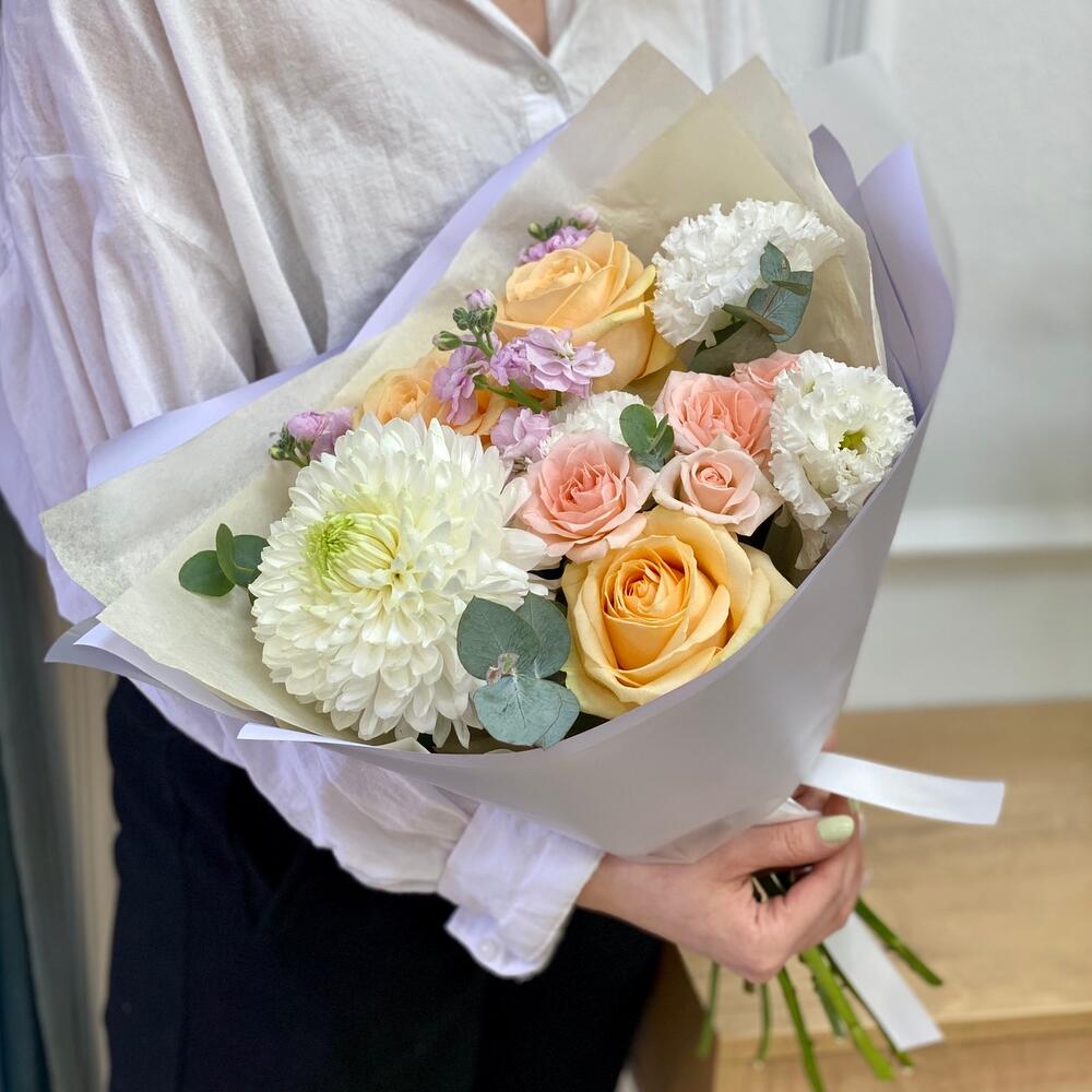 Роза кремовая – 3 шт.Кустовая роза – 1 шт.Упаковка дизайнерская – 1 шт.Хризантема белая – 1 шт.Эустома алиса – 1 шт.маттиола кустовая – 1 шт.эвкалипт 50 – 4 шт.
