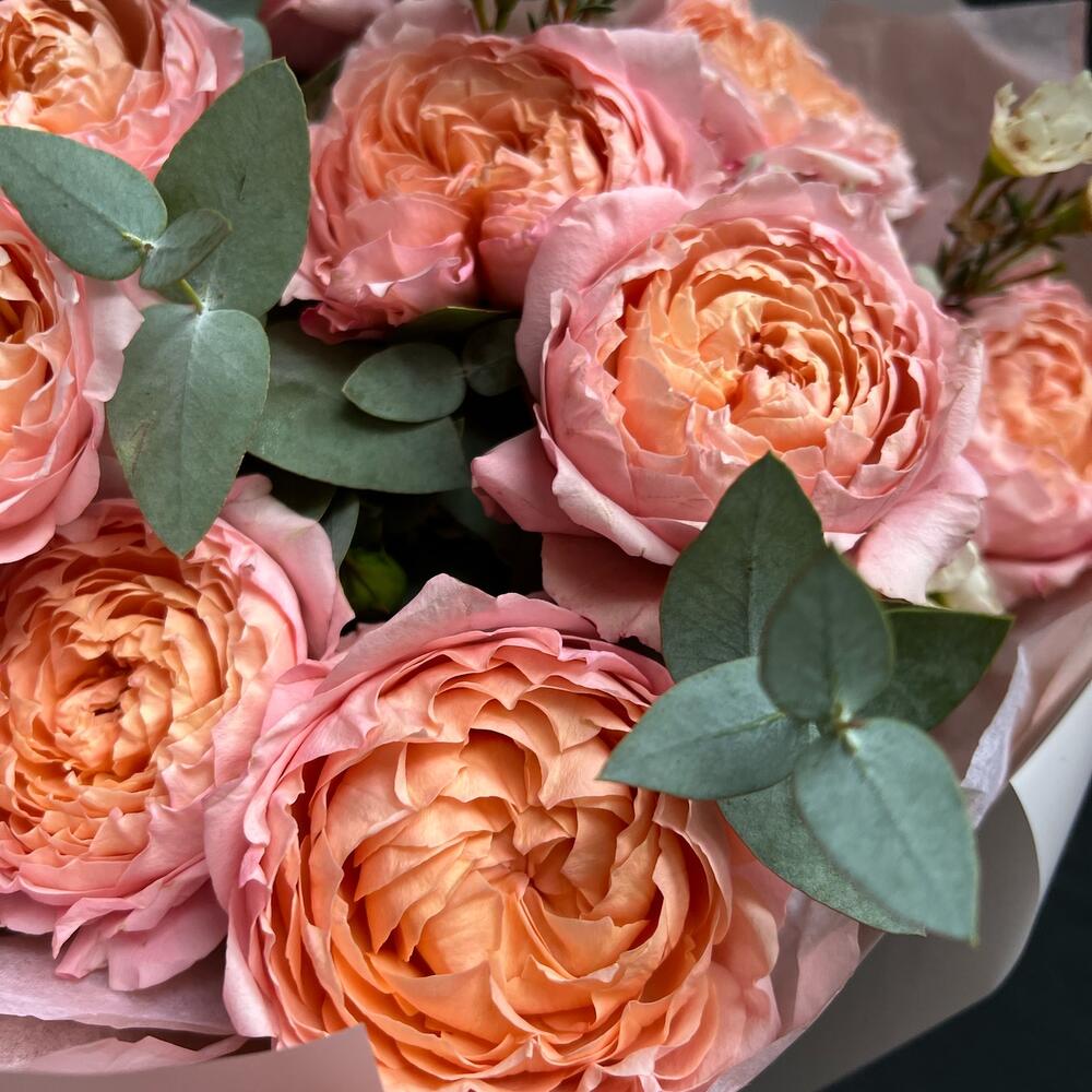 Букет из кустовой пионовидной розы, хамелациум и эвкалипта