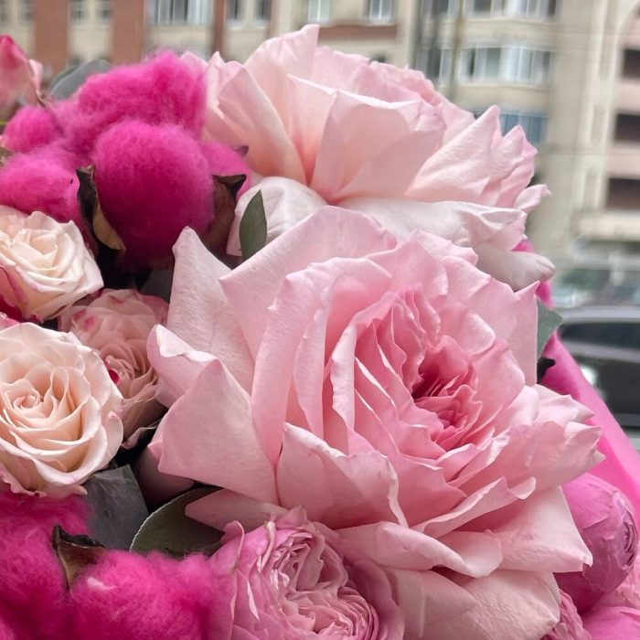 Букет из пионоаиднвх роз в дизайнерском оформлении