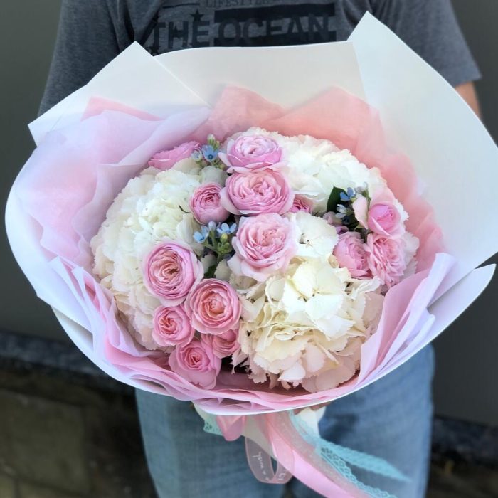 Букет из пионовидной розы, гортензии и оксипеталума «Нежность»