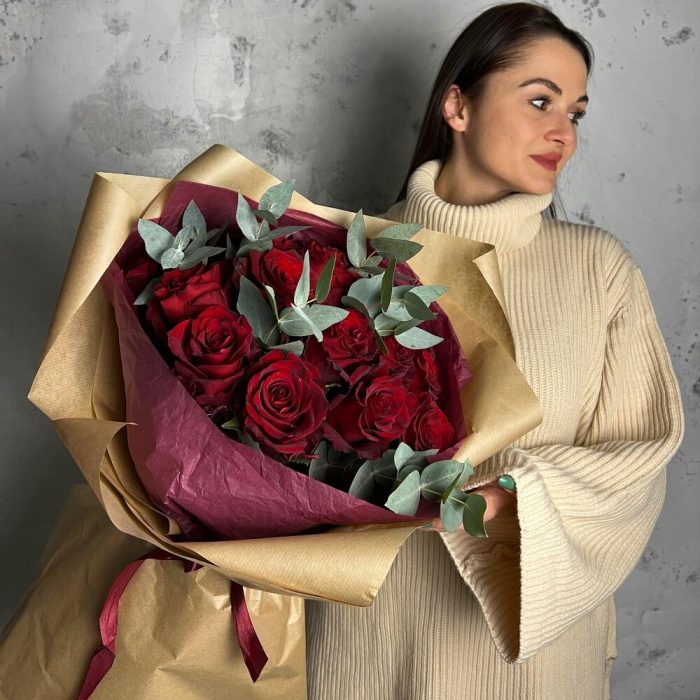 роза эваадор 60 см – 15 шт.Эвкалипт – 5 шт.Упаковка дизайнерская – 3 шт.Лента атласная – 1 шт.