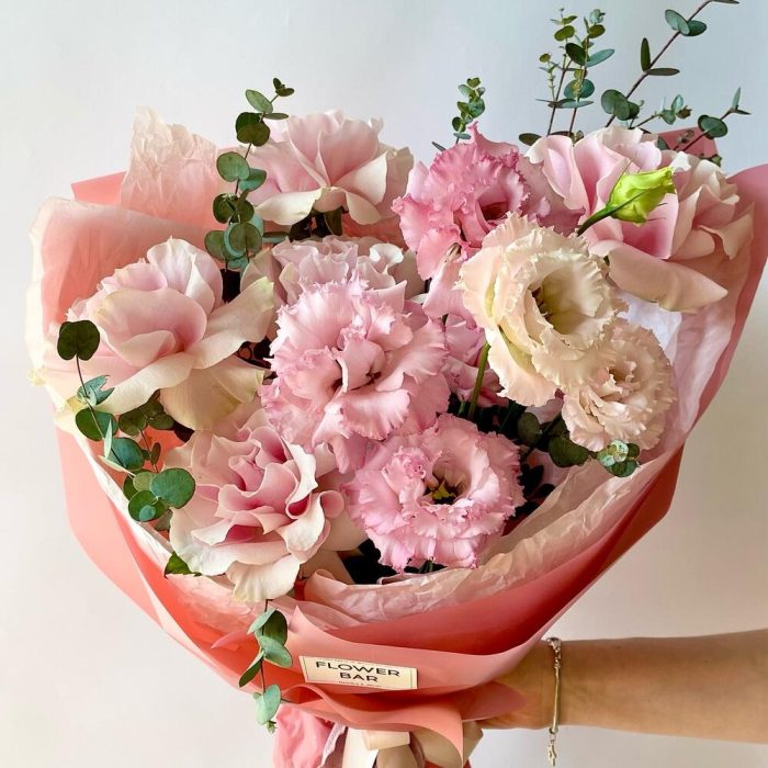 Эвкалипт – 3 шт.Тишью – 2 шт.Фисташка – 3 шт.Упаковка дизайнерская – 1 шт.Роза французская – 5 шт.Лизиантус махровый – 3 шт.лента текстильная – 1 шт.