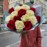 роза красная фридом – 8 шт.Роза белая мондиаль – 7 шт.Упаковка дизайнерская – 1 шт.