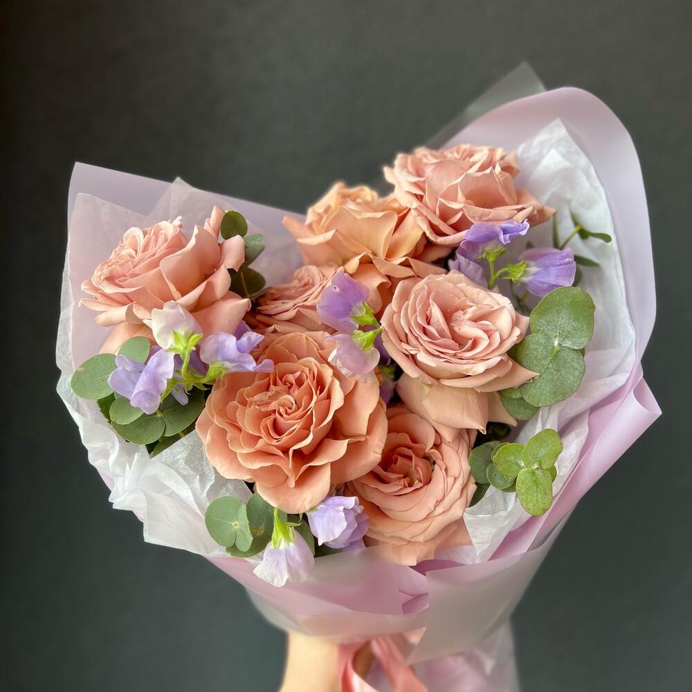Пионовидная роза – 7 шт.Латирус – 4 шт.Эвкалипт – 3 шт.декоративная упаковка – 1 шт.Атласная лента – 1 шт.