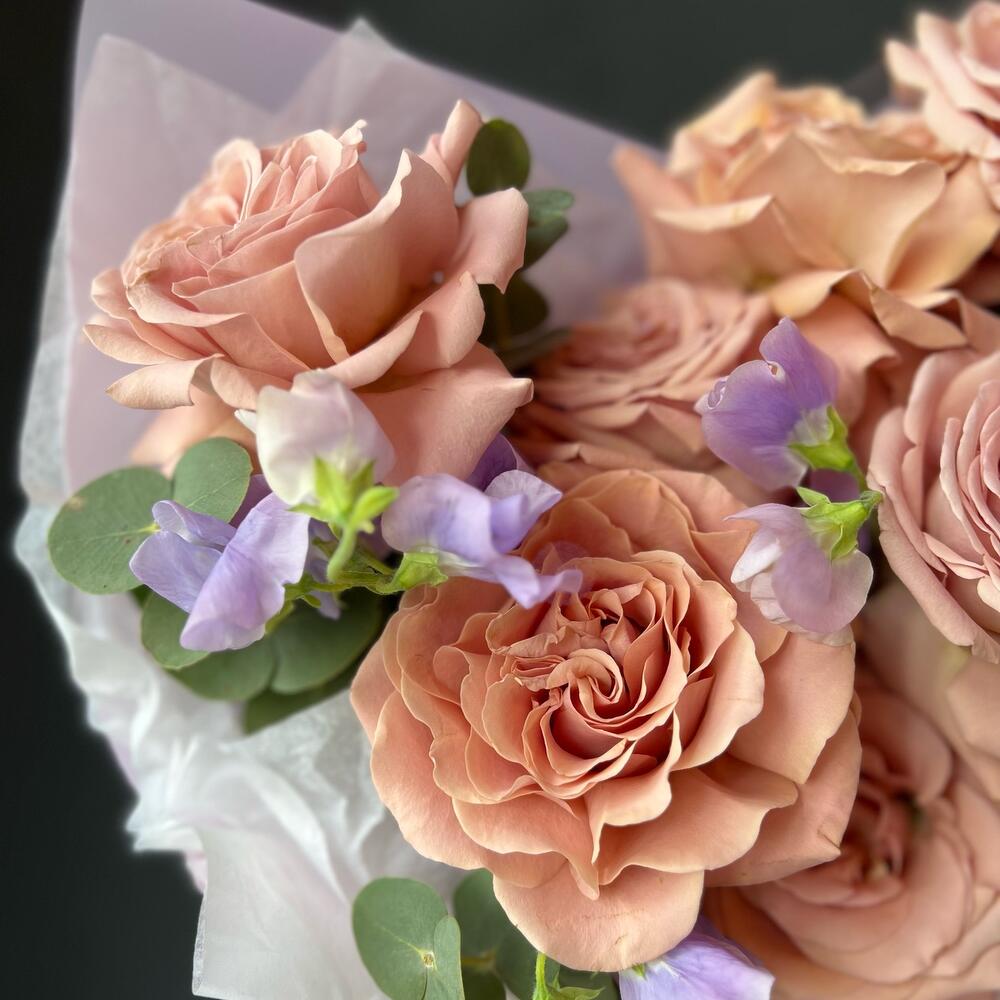 Букет с пионовидной розой, латирус и эвкалипт «Сиреневый туман»