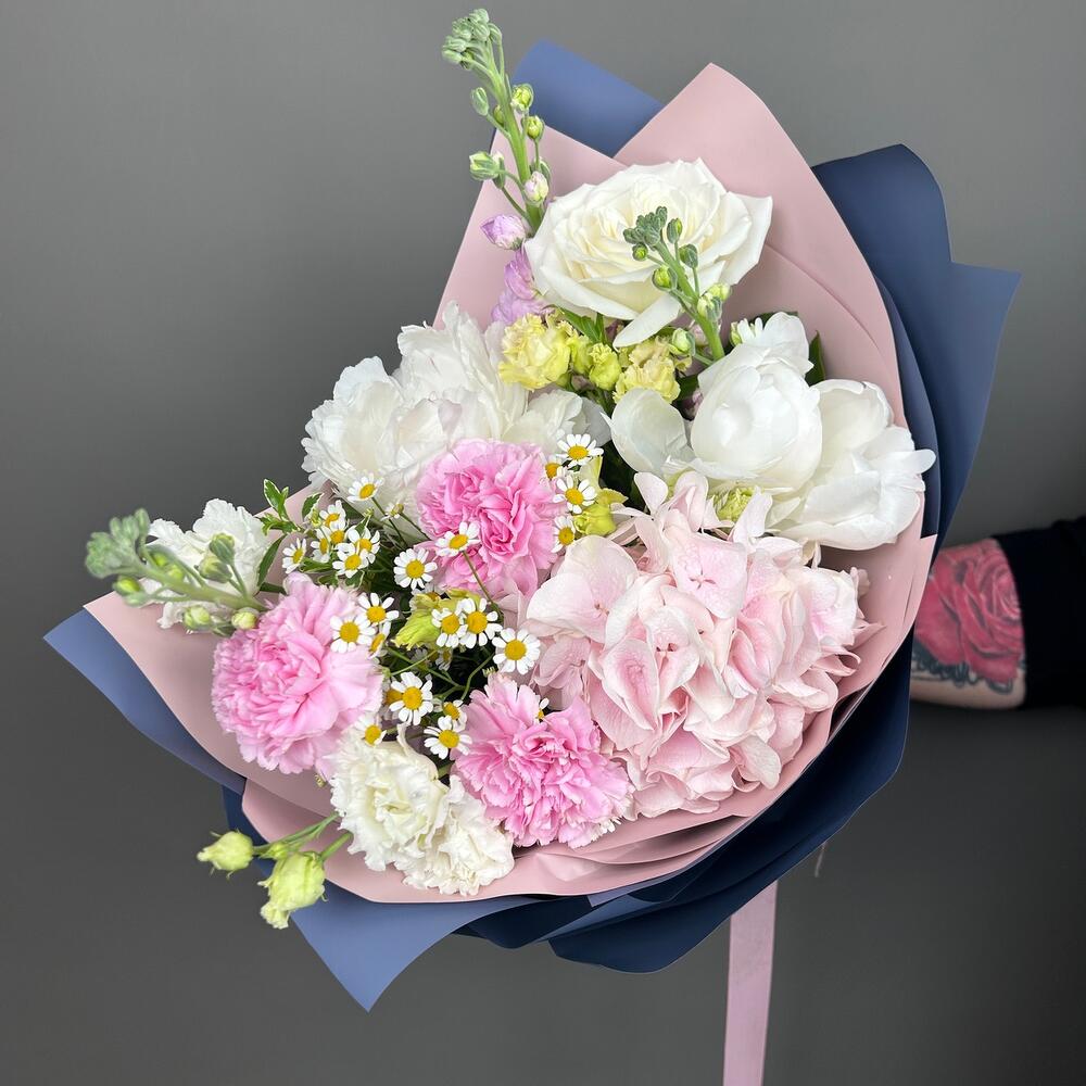 Гортензия – 1 шт.Пион – 2 шт.роза плая бланка – 1 шт.Эустома – 2 шт.Питтоспорум – 1 шт.Диантус – 3 шт.Танацетум – 1 шт.Маттиола – 3 шт.Дизайнерская упаковка – 1 шт.
