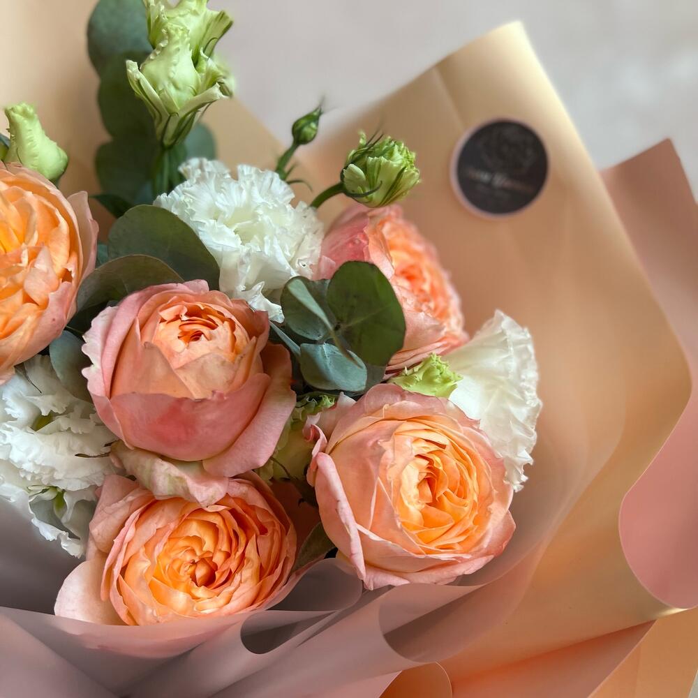 Пионовидная роза – 5 шт.Лизиантус (эустома) – 2 шт.Эвкалипт – 2 шт.Дизайнерская упаковка – 1 шт.Атласная лента – 1 шт.