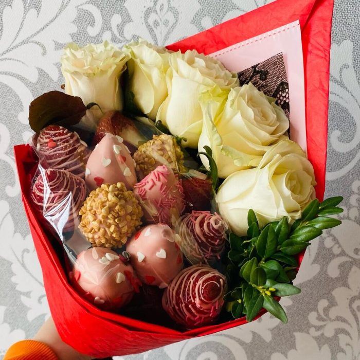 Клубника – 12 шт.Роза – 5 шт.Шоколад – 1 шт.Упаковка дизайнерская – 1 шт.
