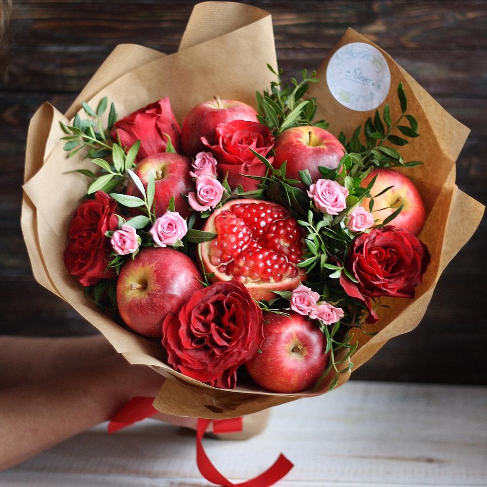Оригинальный фруктово-Цветочный букет в красной страстной гамме с нежными маленькими родовыми кустовыми розами.Идеальный подарок, который не только удивит, но и не оставит голодным.Бесплатная Доставка в пределах КАД