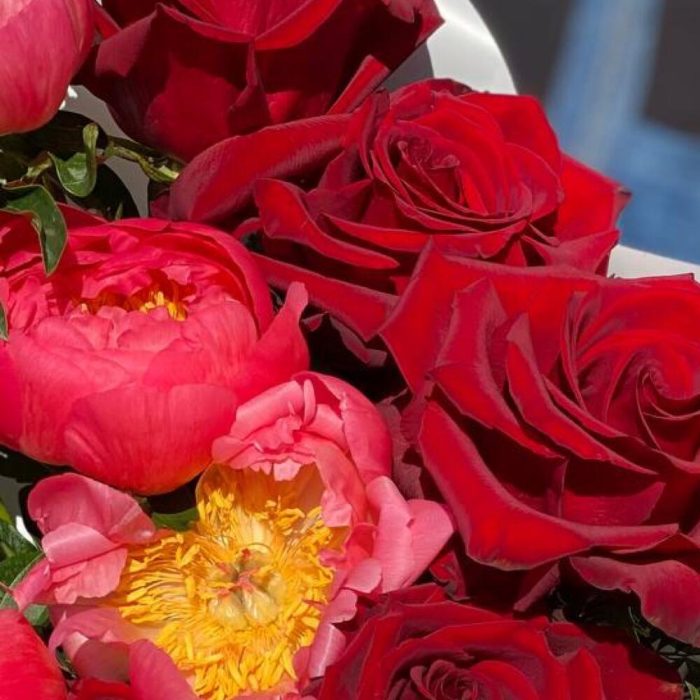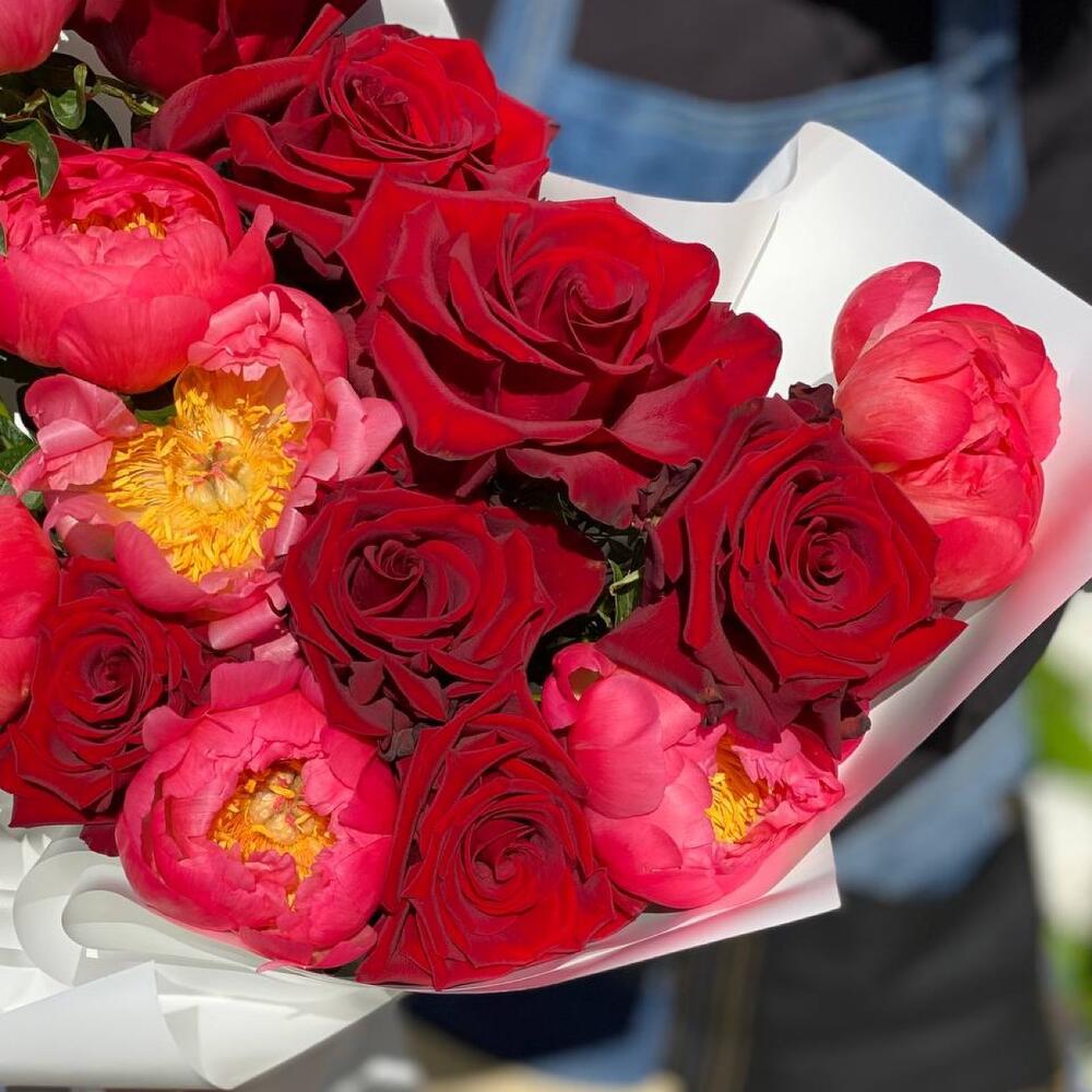 Роза Эквадор – 8 шт.Подарочная упаковка – 1 шт.Средство для продления жизни цветов – 1 шт.пион coral charm – 9 шт.